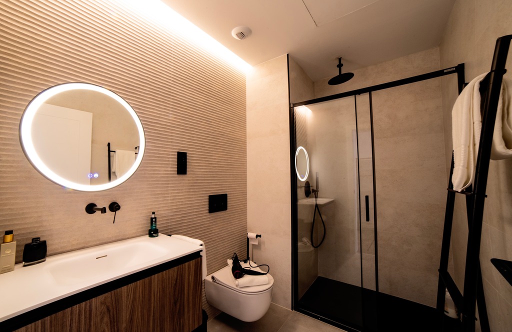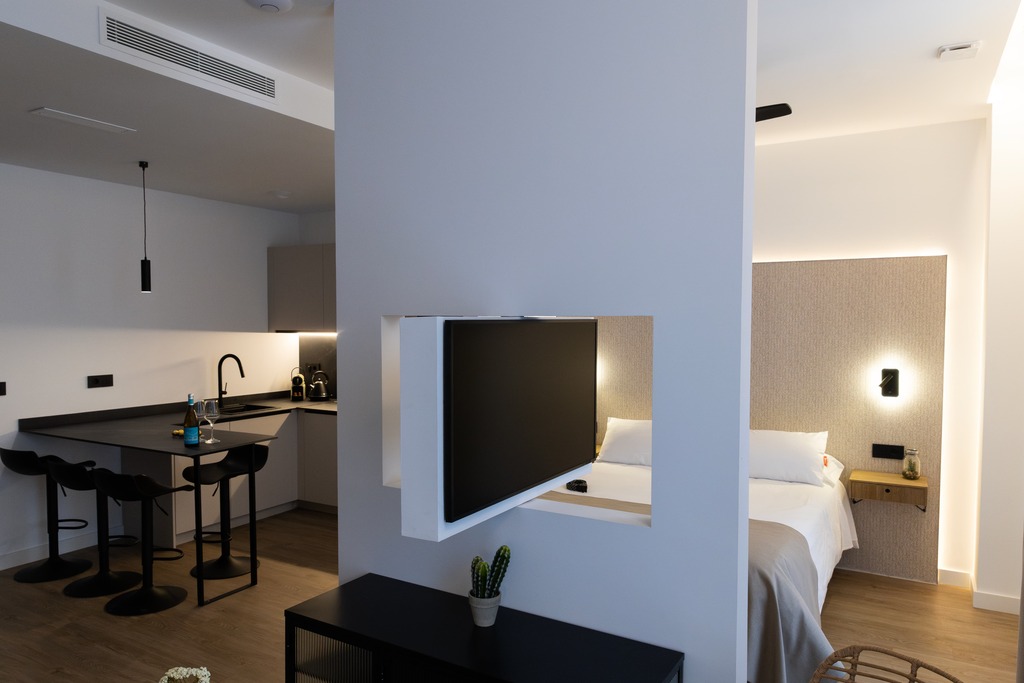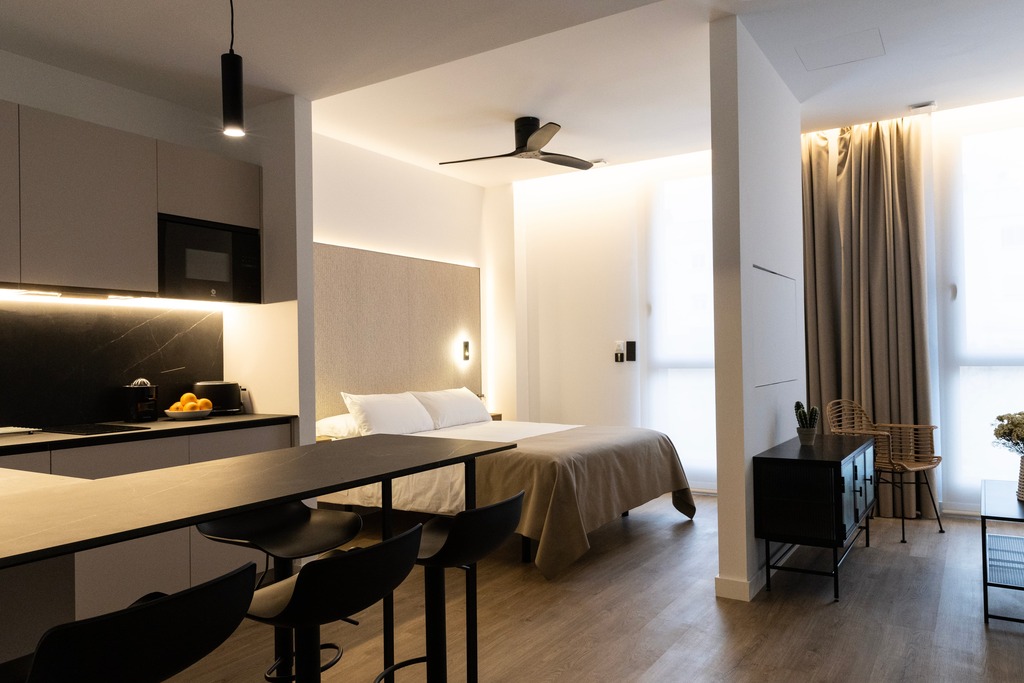 El Estudio Deluxe es un apartamento espacioso y luminoso, con todo integrado en un solo ambiente. El baño se encuentra al inicio del apartamento y cuenta con una pared parcial que separa el salón del dormitorio, ofreciendo privacidad sin perder sensación de amplitud. El alojamiento cuenta con TV de pantalla plana, baño privado con ducha y secador de pelo, cocina con nevera, lavavajillas y microondas. Hay fogones, tostadora, cafetera y hervidor de agua. A tan solo unos minutos de las playa Las Arenas y Malvarrosa.